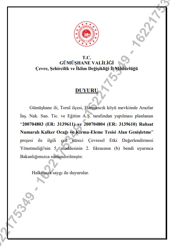 200704803 (ER: 3139611) ve 200704804 (ER: 3139610) Ruhsat" Numaralı Kalker Ocağı ve Kırma-Eleme Tesisi Alan Genişletme